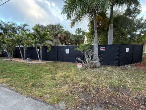 Exclusive Fences showcasing this 6′ black vinyl chain link fence with a 12′ double drive gate and windscreen completed recently on an empty lot in the Pompano Beach – Broward County, FL area. The homeowner is building a house on the lot and he is having problems with people dropping garbage there. Problem solved!