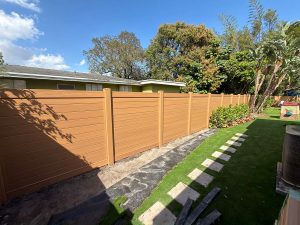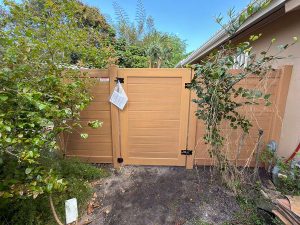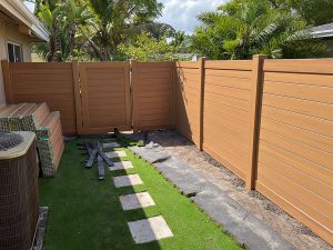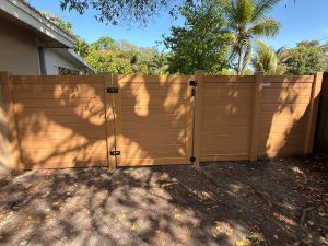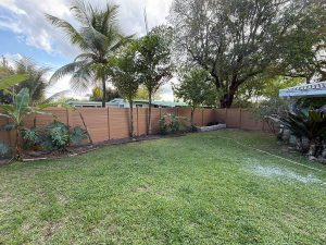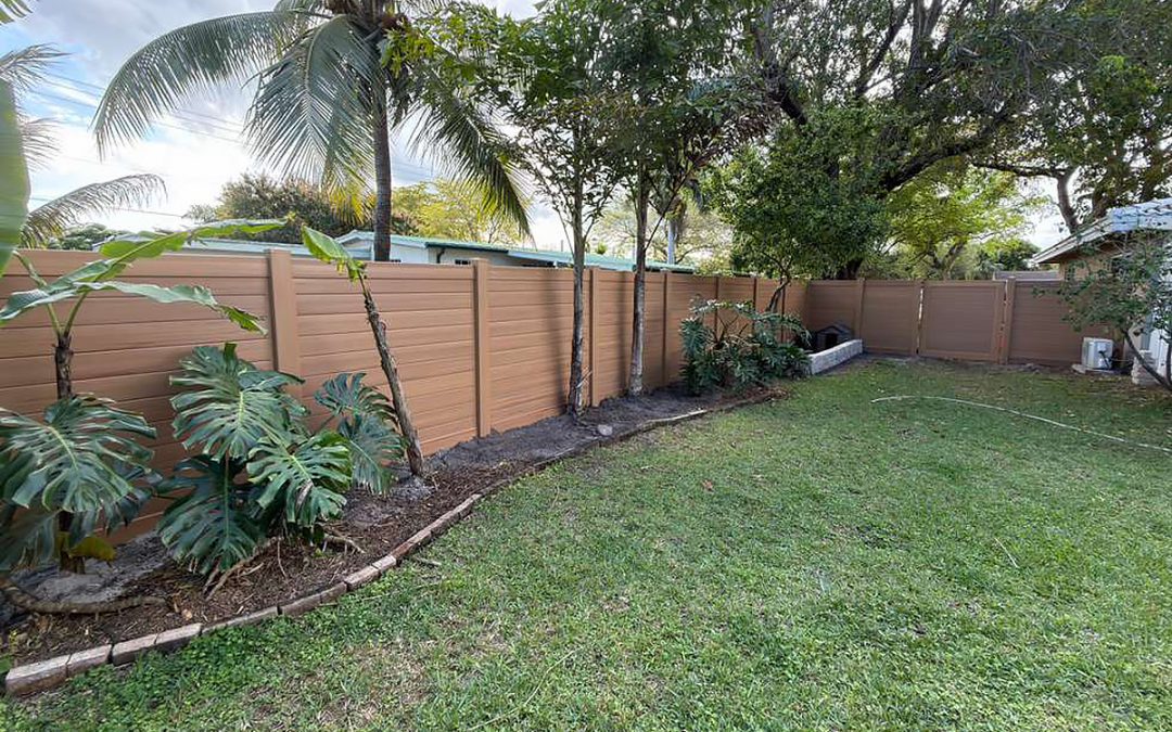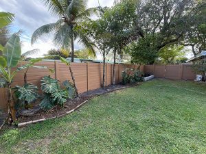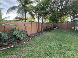 Exclusive Fences showcasing this beautiful new 6′ horizontal wood grain cypress PVC privacy fence at a residence in the Plantation – Broward County, FL area. On this job we first removed the old wood fence.