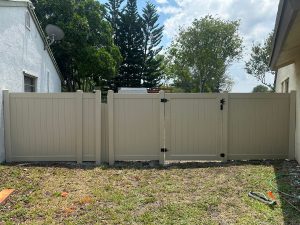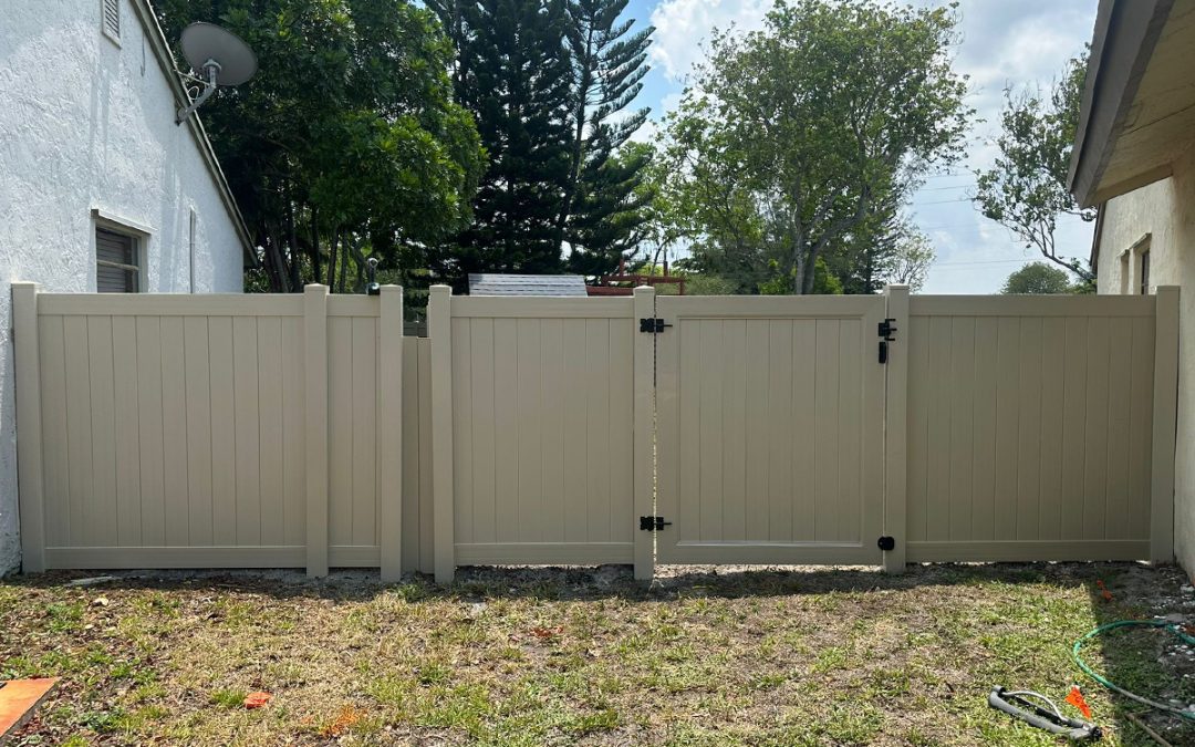 Exclusive Fences showcasing this tan PVC privacy fence at a residence in the Davie – Broward County, FL area.