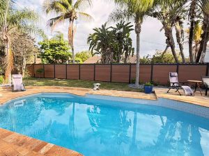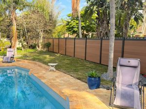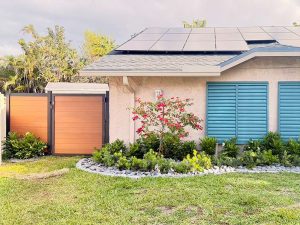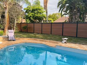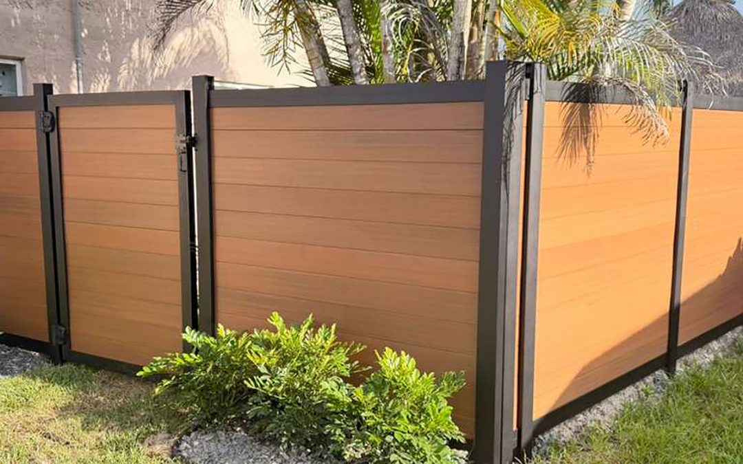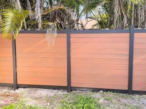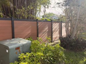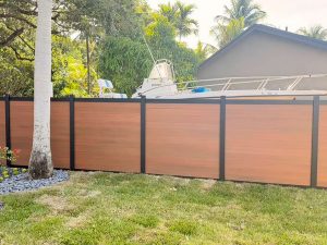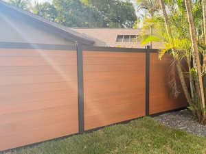 Exclusive Fences showcasing this beautiful 6′ horizontal teak composite privacy fence with a metal frame at a residence in the Plantation – Broward County, FL area. This was a large job with approximately 247′ of fence with a 4′ walk gate.